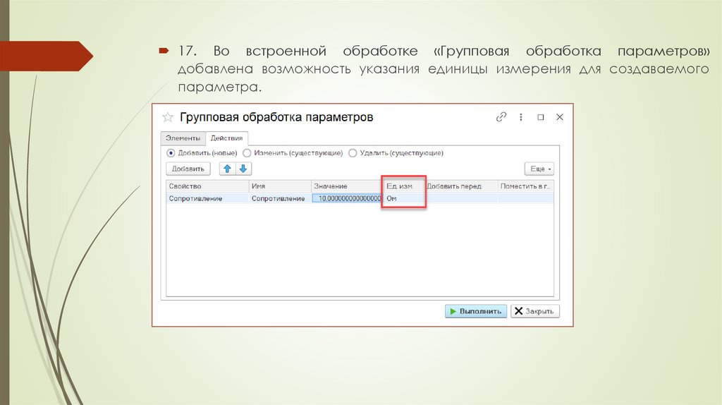 17. Во встроенной обработке «Групповая обработка параметров»добавлена возможность указания единицы измерения для создаваемого
