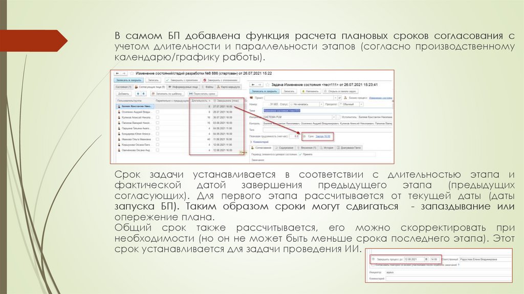В самом БП добавлена функция расчета плановых сроков согласования сучетом длительности и параллельности этапов (согласно производственному