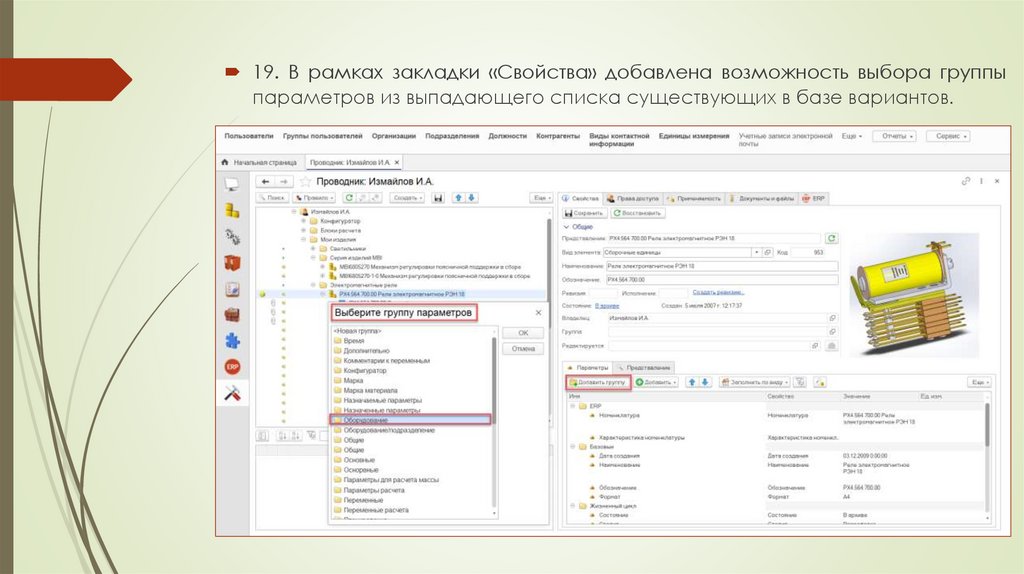 19. В рамках закладки «Свойства» добавлена возможность выбора группыпараметров из выпадающего списка существующих в базе вариантов.