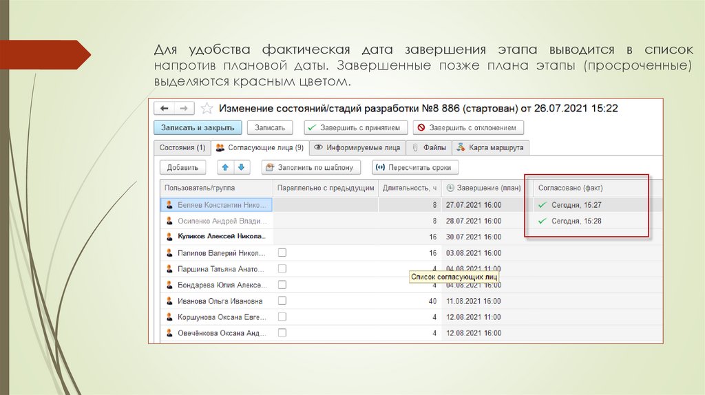 Для удобства фактическая дата завершения этапа выводится в списокнапротив плановой даты. Завершенные позже плана этапы (просроченные)