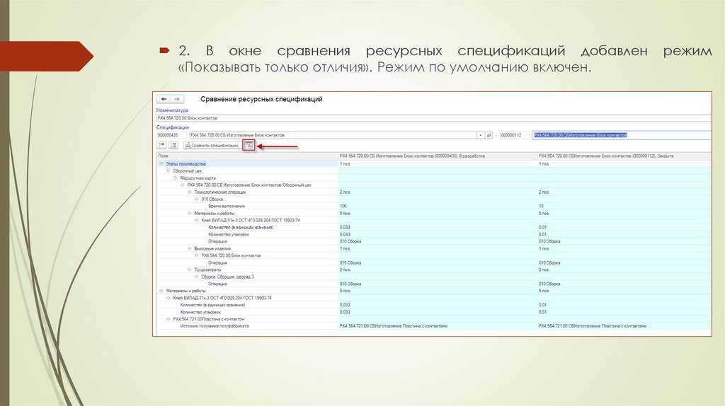 2. В окне сравнения ресурсных спецификаций добавлен«Показывать только отличия». Режим по умолчанию включен.