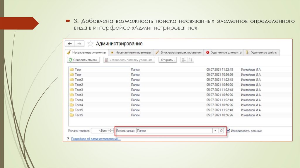 3. Добавлена возможность поиска несвязанных элементов определенноговида в интерфейсе «Администрирование».