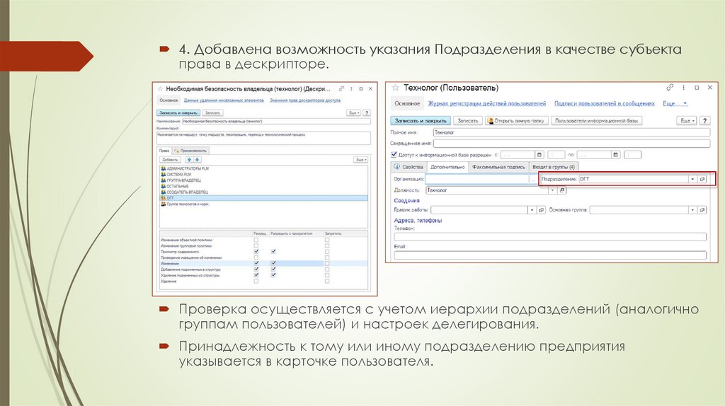 4. Добавлена возможность указания Подразделения в качестве субъектаправа в дескрипторе.