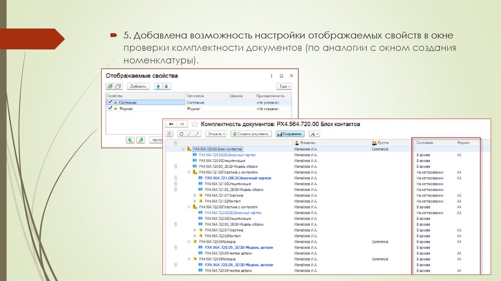 5. Добавлена возможность настройки отображаемых свойств в окнепроверки комплектности документов (по аналогии с окном создания