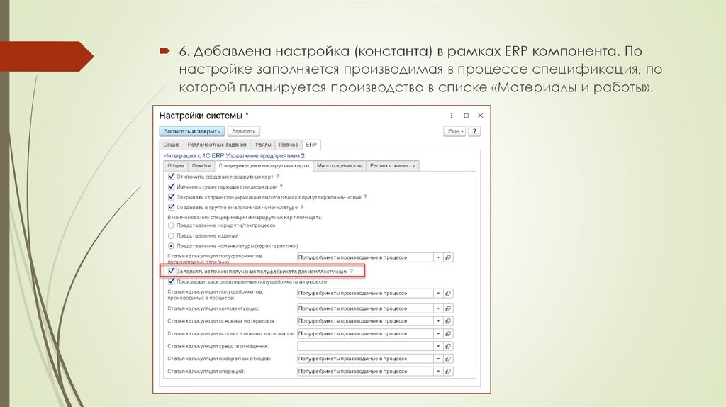 6. Добавлена настройка (константа) в рамках ERP компонента. Понастройке заполняется производимая в процессе спецификация, по