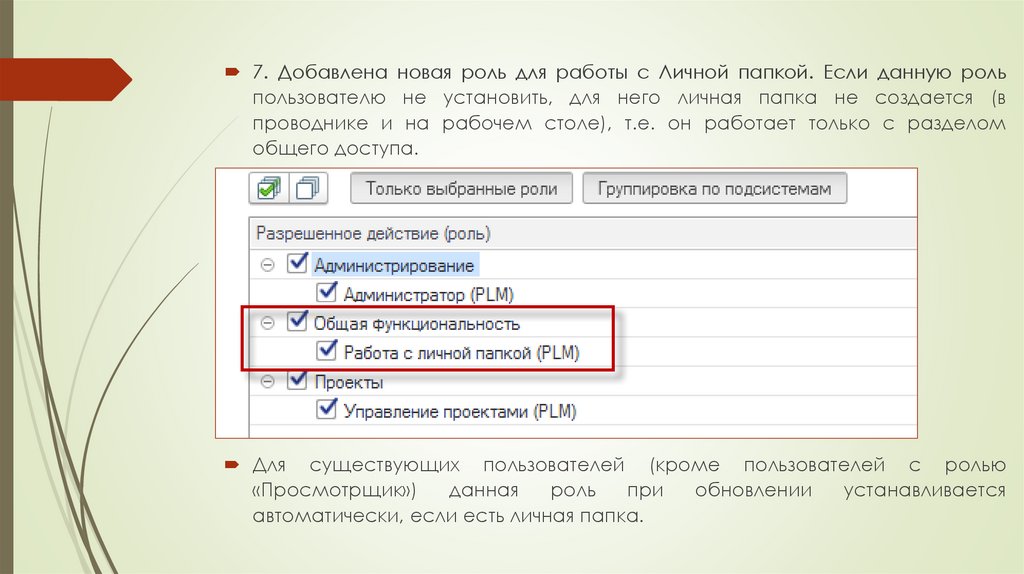 7. Добавлена новая роль для работы с Личной папкой. Если данную рольпользователю не установить, для него личная папка не создается (в