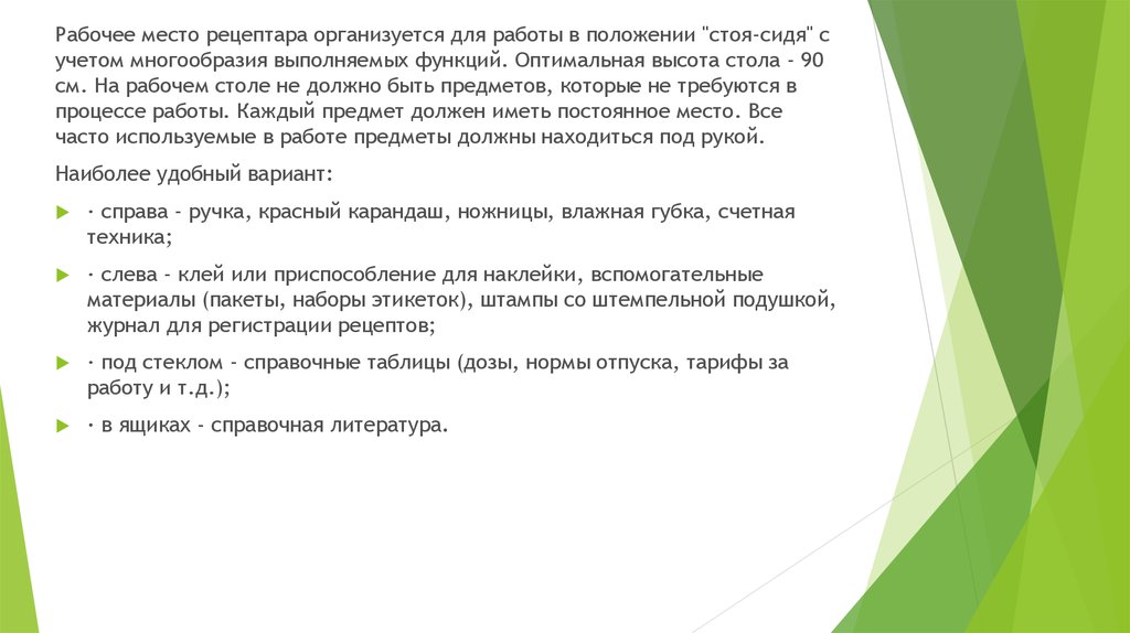Рабочее место рецептара организуется для работы в положении "стоя-сидя" сучетом многообразия выполняемых функций. Оптимальная высота стола - 90