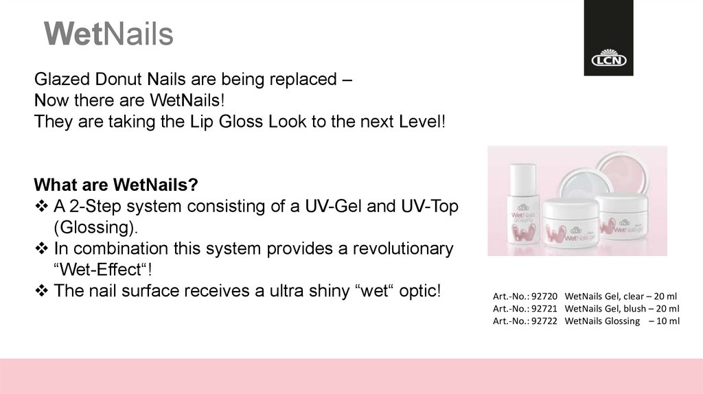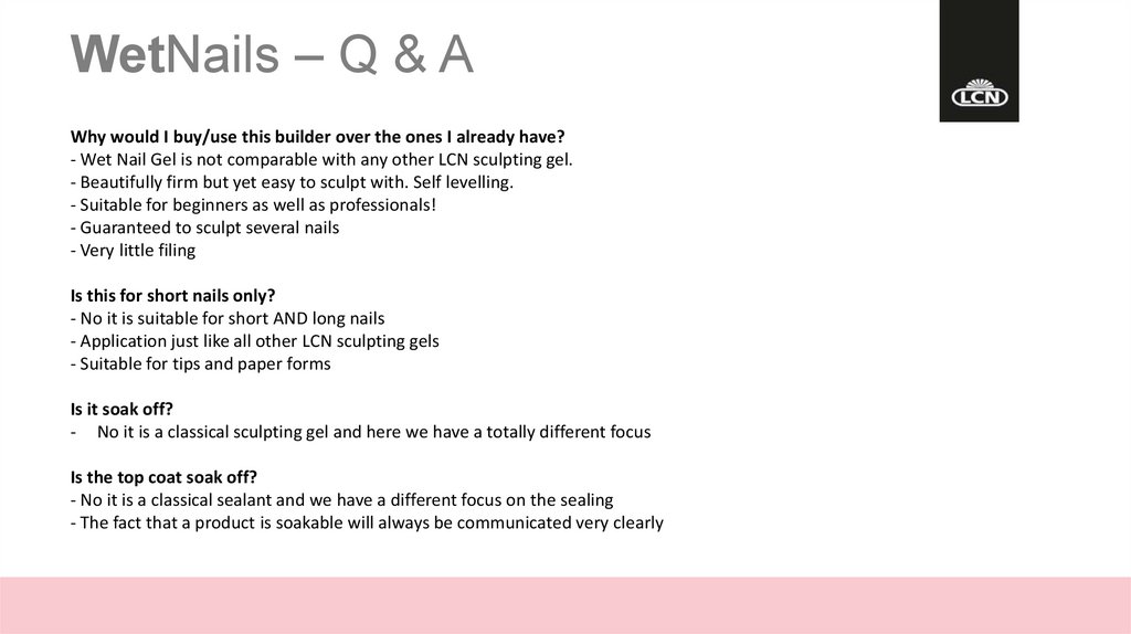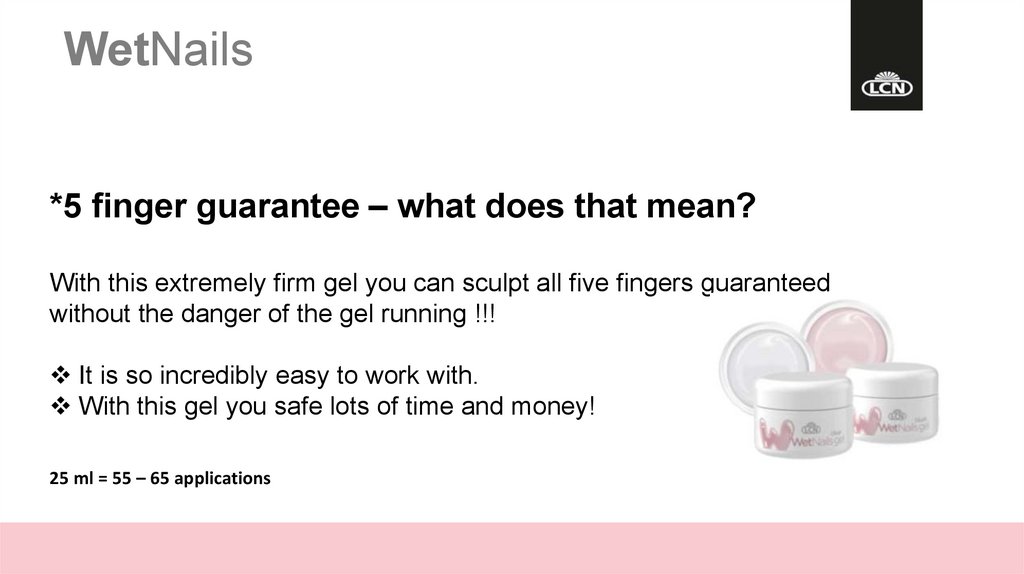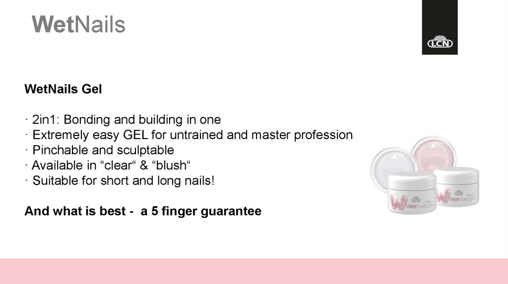 - Wet Nail Gel is not comparable with any other LCN sculpting gel.