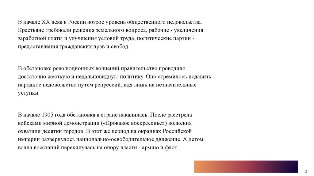 В начале XX века в России возрос уровень общественного недовольства.Крестьяне требовали решения земельного вопроса, рабочие - увеличения