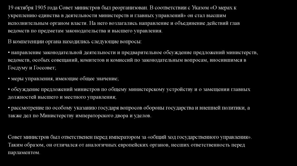Совет министров был ответственен перед императором за «общий ход государственного управления».