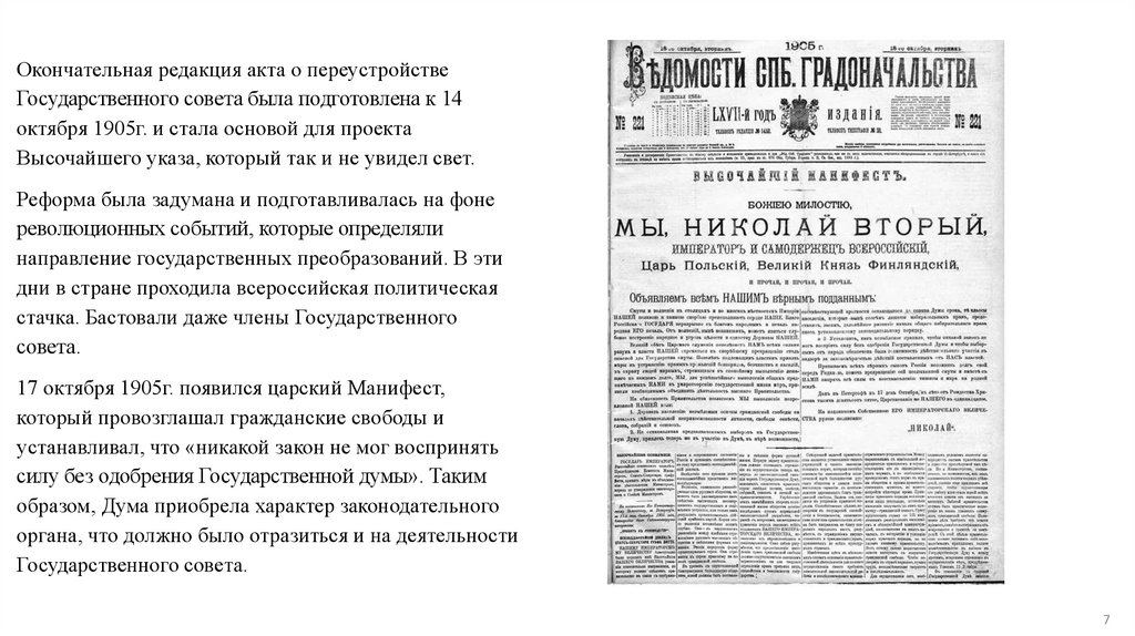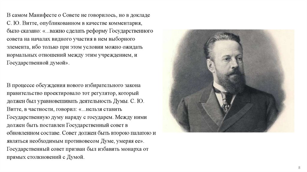 В самом Манифесте о Совете не говорилось, но в докладеС. Ю. Витте, опубликованном в качестве комментария,