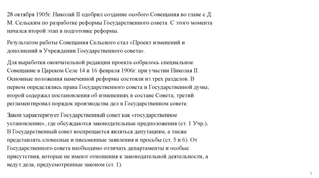 28 октября 1905г. Николай II одобрил создание особого Совещания во главе с Д.М. Сельским по разработке реформы Государственного совета. С этого момента