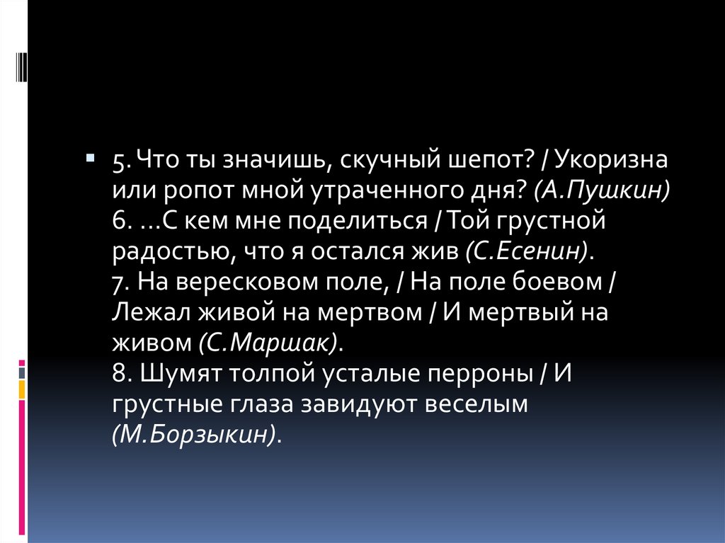 5. Что ты значишь, скучный шепот? / Укоризнаили ропот мной утраченного дня? (А.Пушкин)