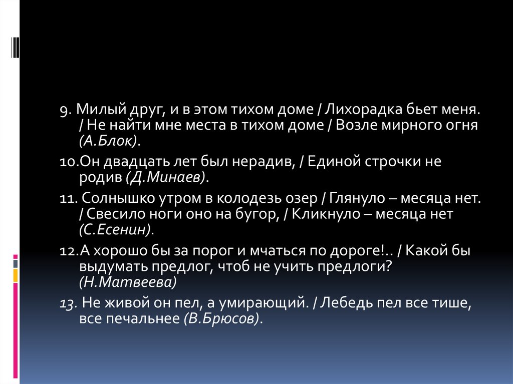 9. Милый друг, и в этом тихом доме / Лихорадка бьет меня./ Не найти мне места в тихом доме / Возле мирного огня