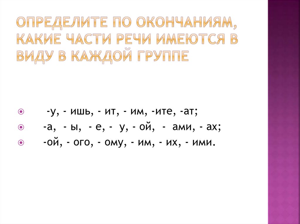 -у, - ишь, - ит, - им, -ите, -ат;-а, - ы, - е, - у, - ой, - ами, - ах;