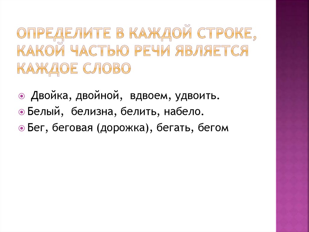 Двойка, двойной, вдвоем, удвоить.Белый, белизна, белить, набело.