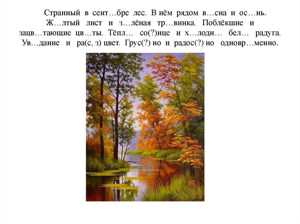 Странный в сент…бре лес. В нём рядом в…сна и ос…нь.Ж…лтый лист и з…лёная тр…винка. Поблёкшие и