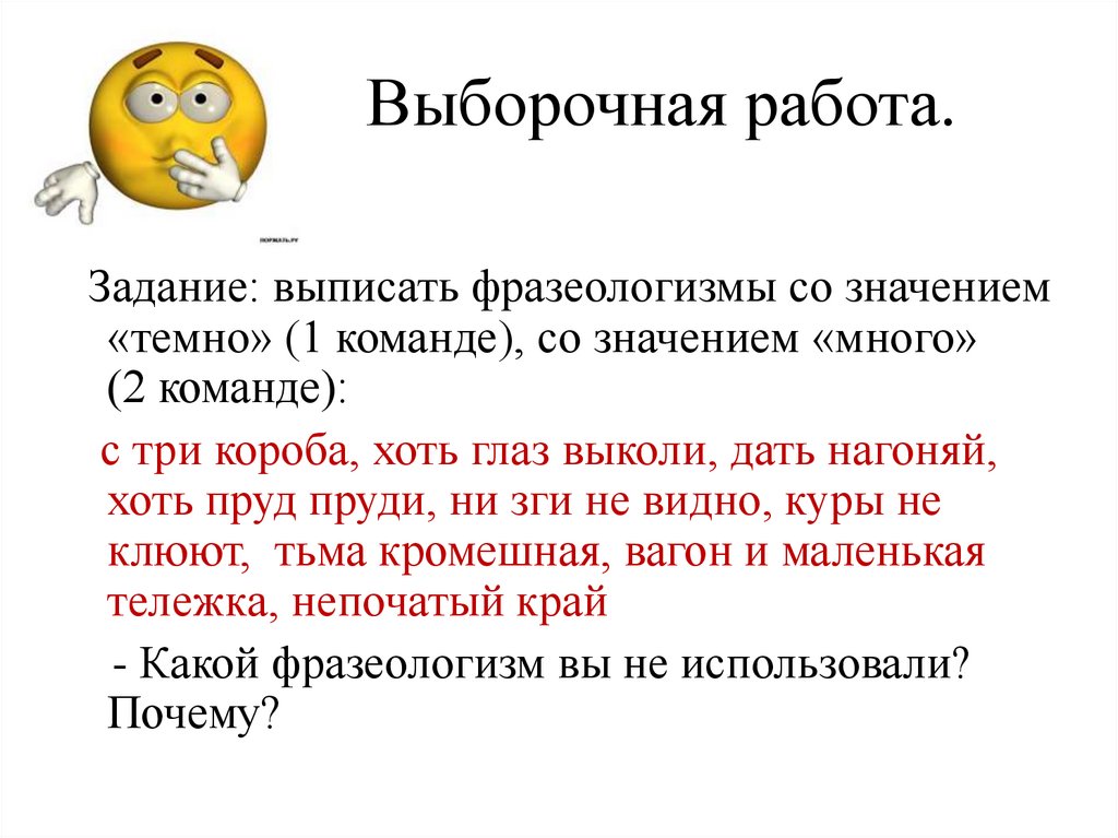 Выборочная работа.Задание: выписать фразеологизмы со значением