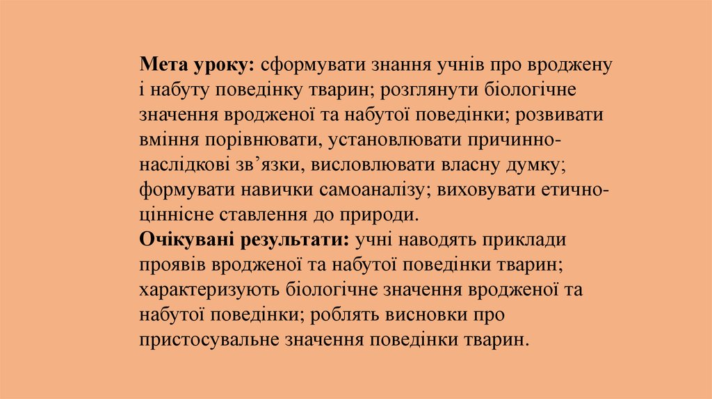 Мета уроку: сформувати знання учнів про вродженуі набуту поведінку тварин; розглянути біологічне