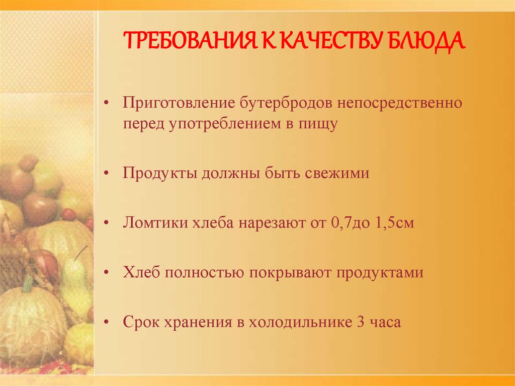 ТРЕБОВАНИЯ К КАЧЕСТВУ БЛЮДА• Приготовление бутербродов непосредственно