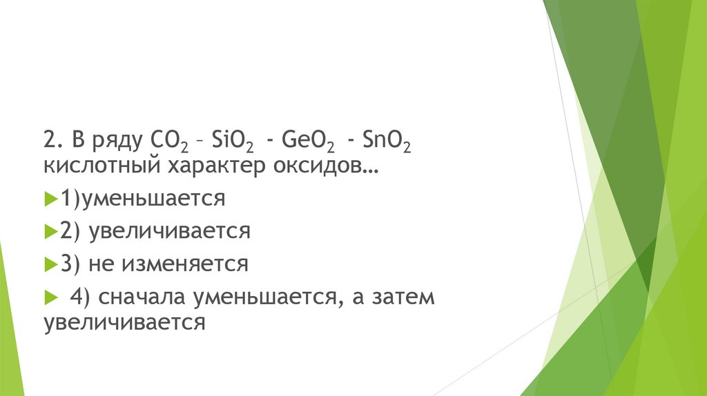 2. В ряду СО2 – SiO2 - GeO2 - SnO2кислотный характер оксидов…