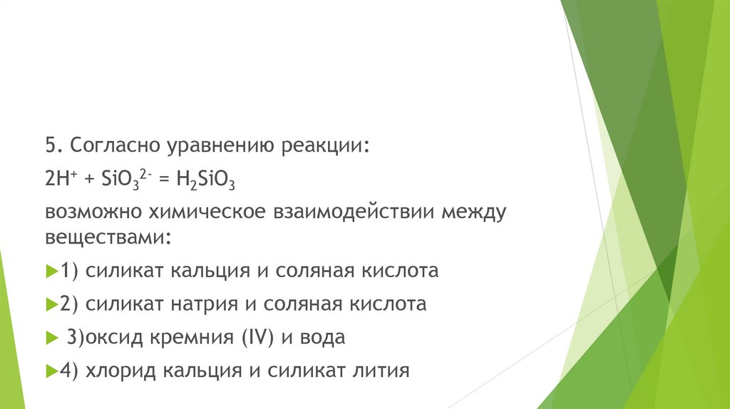 5. Согласно уравнению реакции:2H+ + SiО32- = H2SiO3