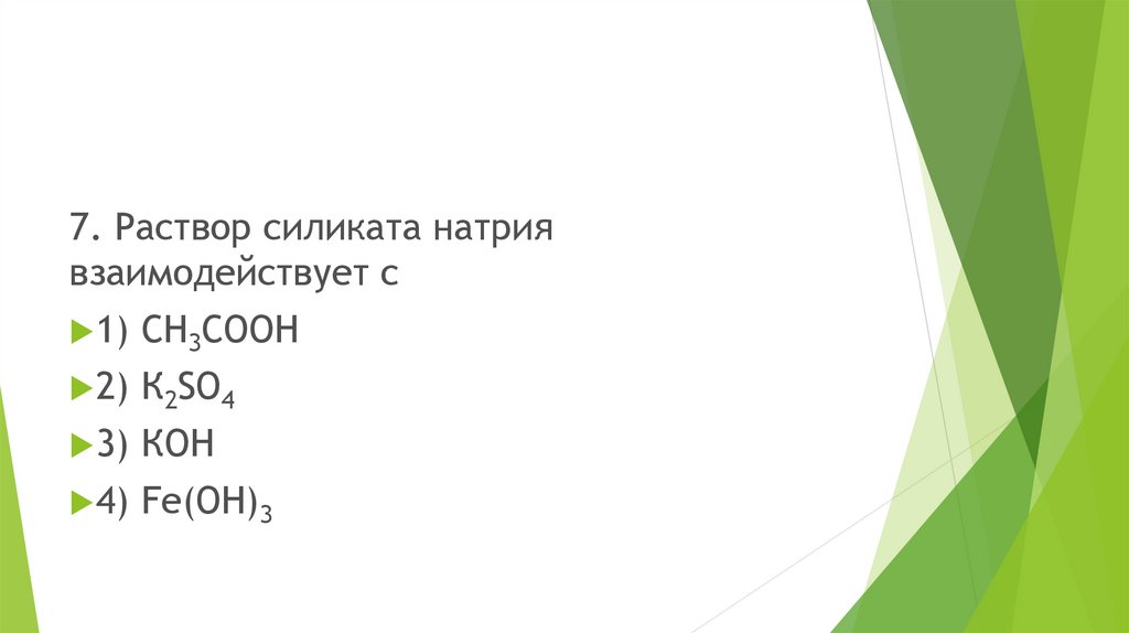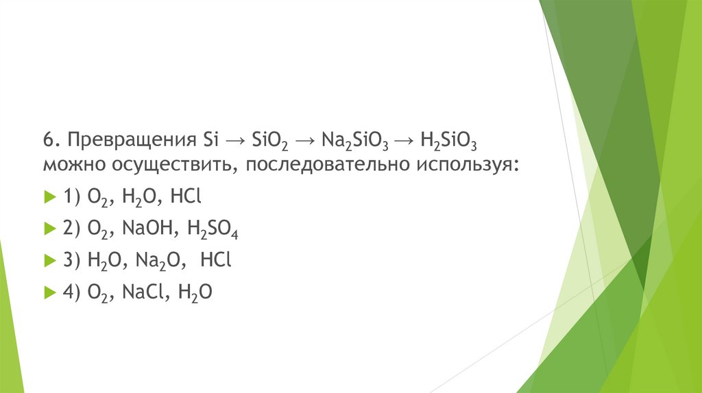 6. Превращения Si → SiO2 → Na2SiO3 → H2SiO3можно осуществить, последовательно используя: