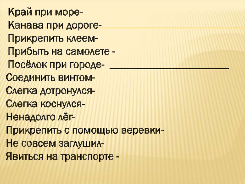 Край при мореКанава при дорогеПрикрепить клеемПрибыть на самолете Посёлок при городе- _____________________________Соединить винтомСлегка дотронулсяСлегка коснулсяНенадолго лёгПрикрепить с помощью веревкиНе совсем заглушилЯвиться на транспорте -