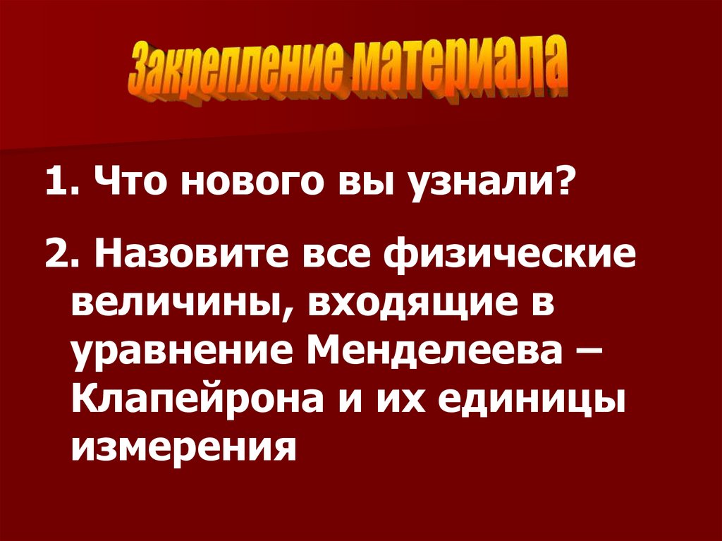 1. Что нового вы узнали?2. Назовите все физические
