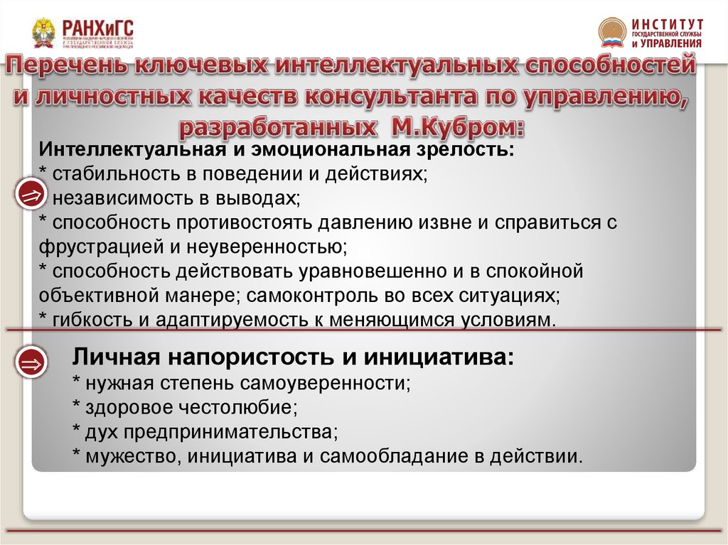 Интеллектуальная и эмоциональная зрелость:* стабильность в поведении и действиях;