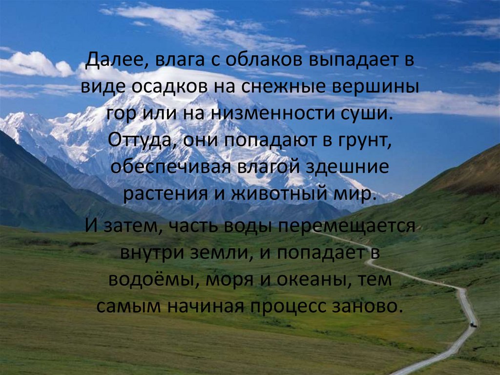 Далее, влага с облаков выпадает ввиде осадков на снежные вершины