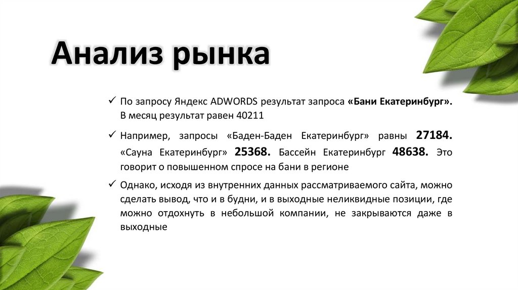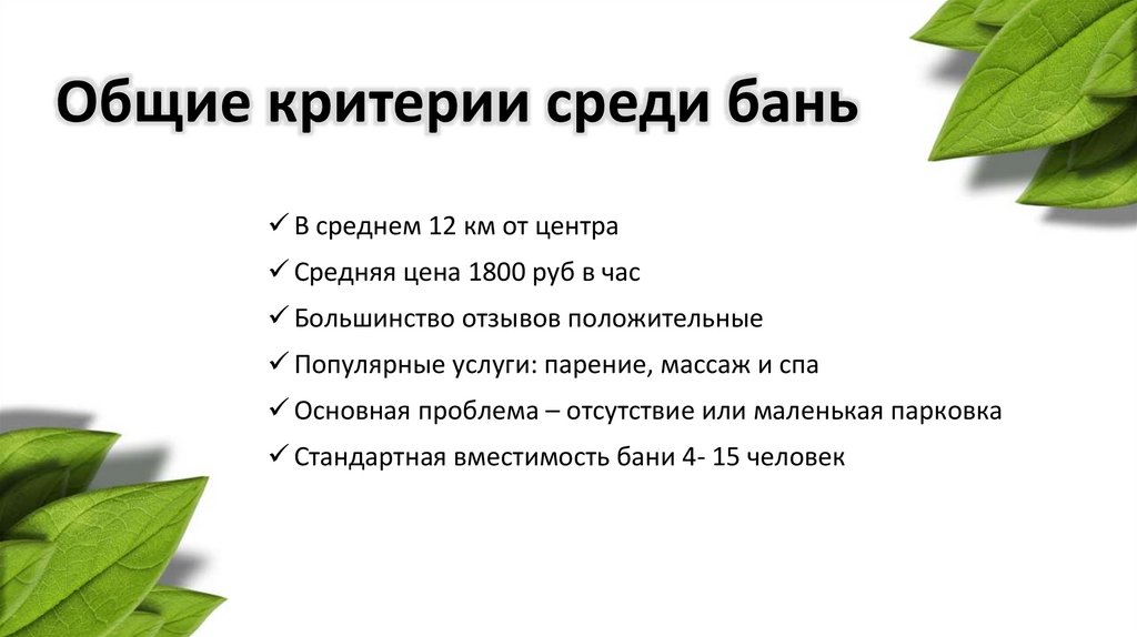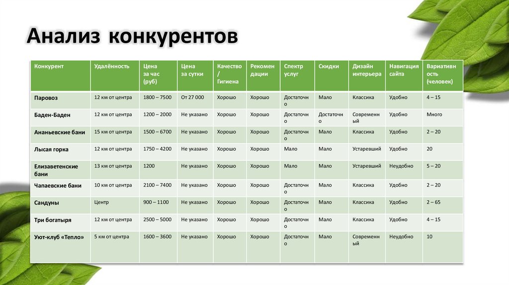 Исходные данные• «Чапаевские бани» - лидер на рынке