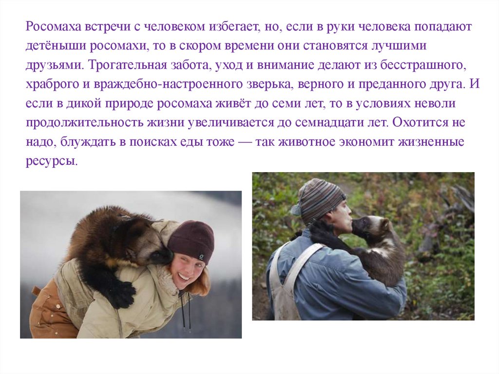 Росомаха встречи с человеком избегает, но, если в руки человека попадаютдетёныши росомахи, то в скором времени они становятся лучшими
