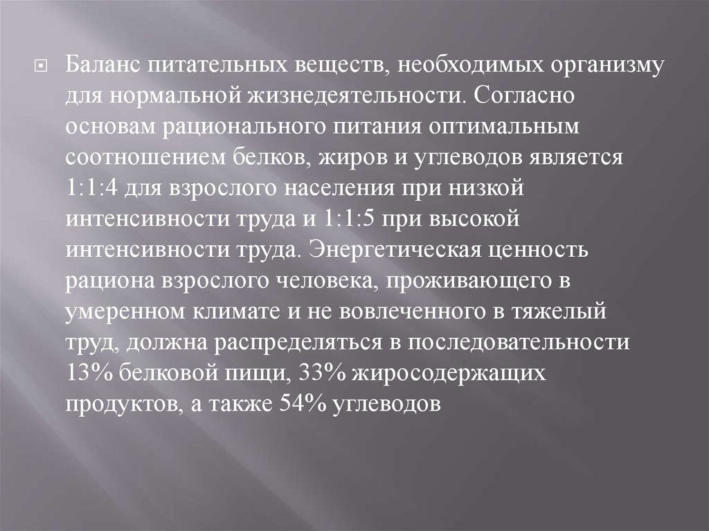 Баланс питательных веществ, необходимых организмудля нормальной жизнедеятельности. Согласно