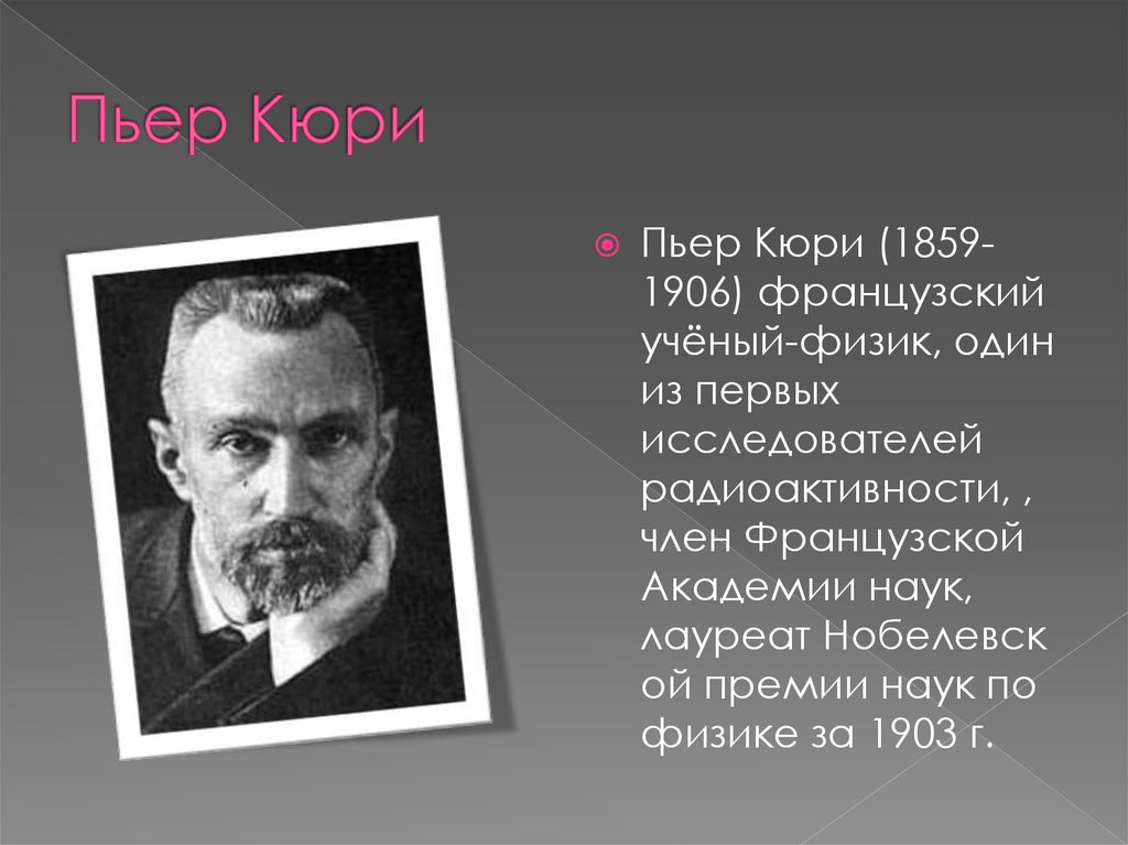 Пьер Кюри (18591906) французскийучёный-физик, один