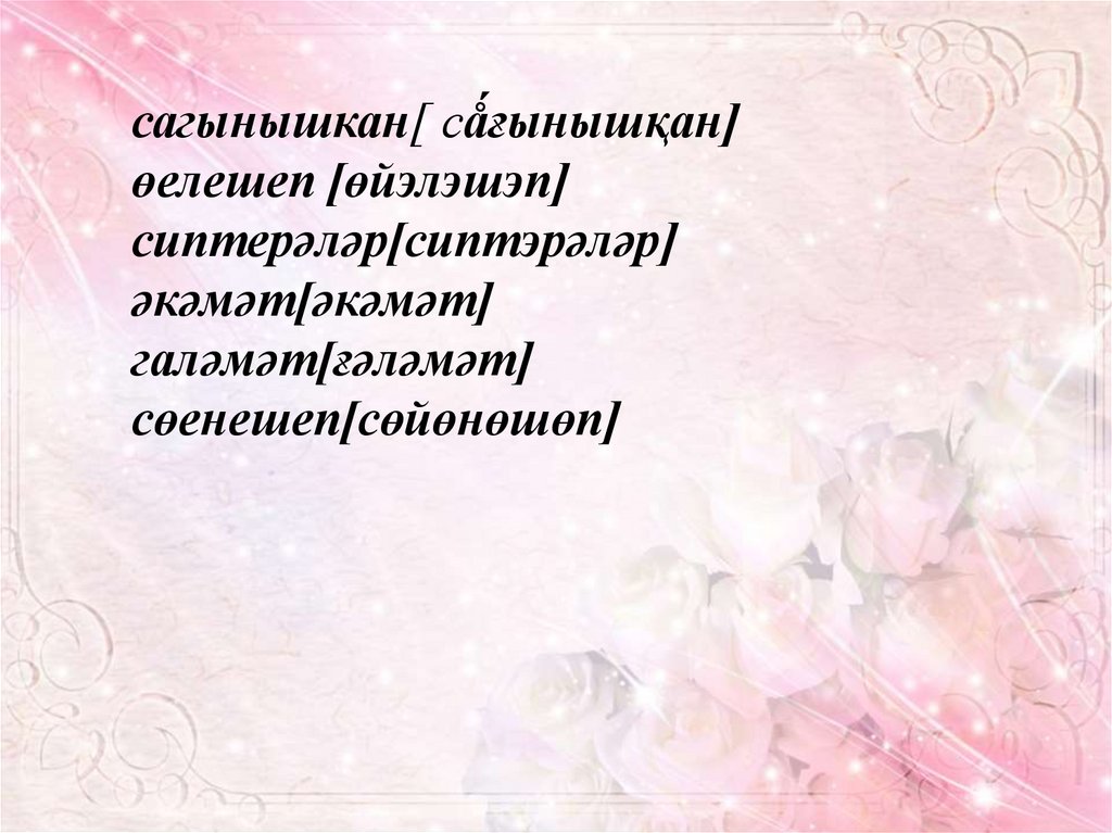 сагынышкан[ сǻғынышқан]өелешеп [өйэлэшэп]