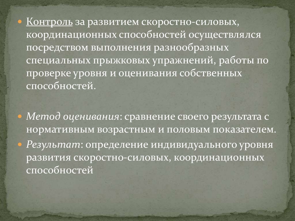 Контроль за развитием скоростно-силовых,координационных способностей осуществлялся