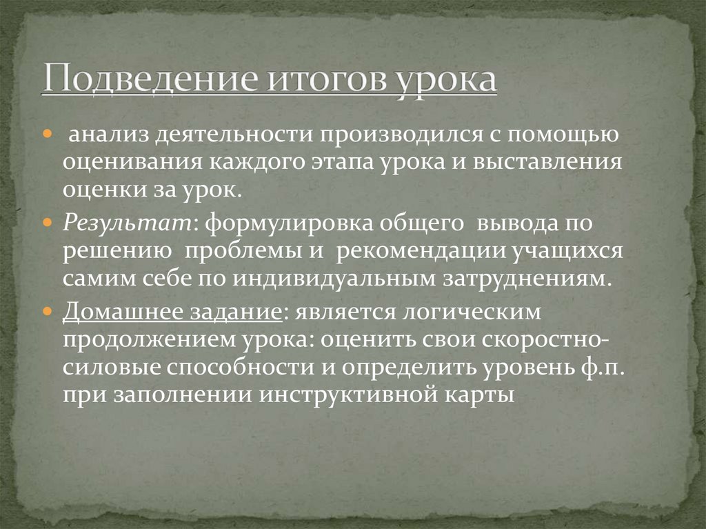 анализ деятельности производился с помощьюоценивания каждого этапа урока и выставления
