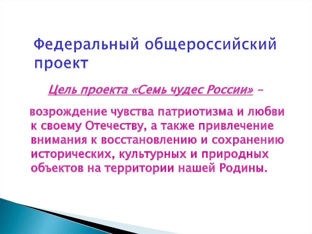Цель проекта «Семь чудес России» –возрождение чувства патриотизма и любви