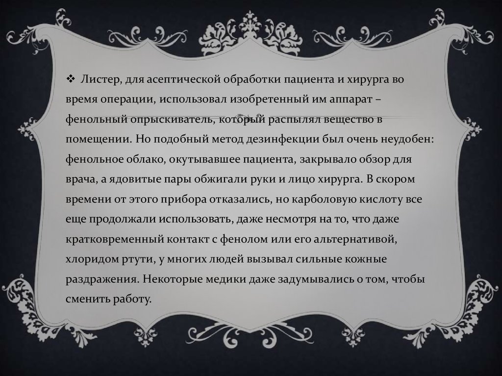 В конце XIX века во время операций для обработки раниспользовалась карболовая кислота (современное