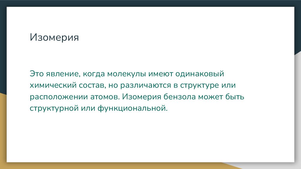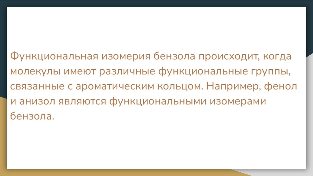 Функциональная изомерия бензола происходит, когдамолекулы имеют различные функциональные группы,