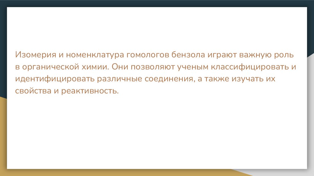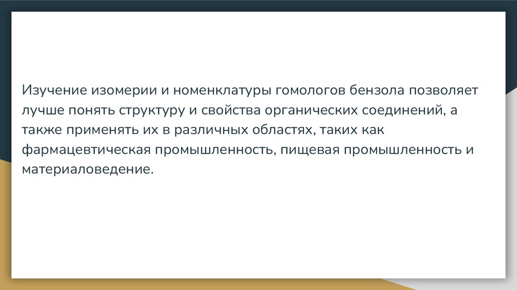 Изучение изомерии и номенклатуры гомологов бензола позволяетлучше понять структуру и свойства органических соединений, а