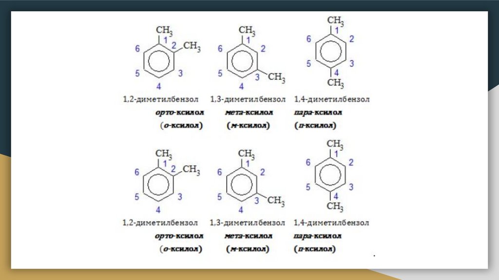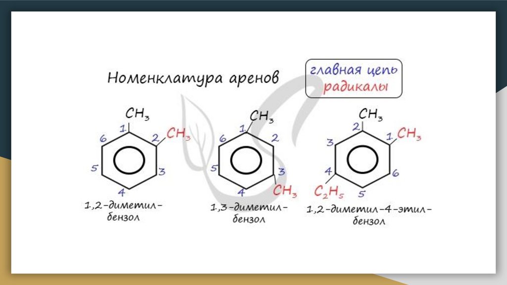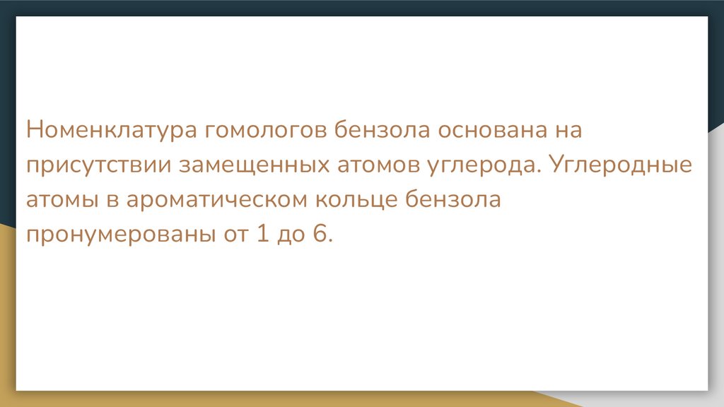 Номенклатура гомологов бензола основана наприсутствии замещенных атомов углерода. Углеродные