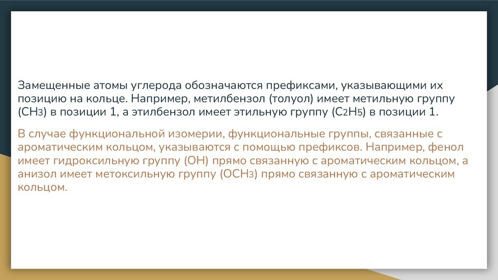 Замещенные атомы углерода обозначаются префиксами, указывающими ихпозицию на кольце. Например, метилбензол (толуол) имеет метильную группу