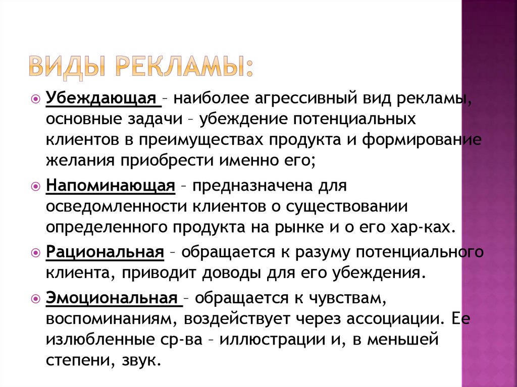 Убеждающая – наиболее агрессивный вид рекламы,основные задачи – убеждение потенциальных