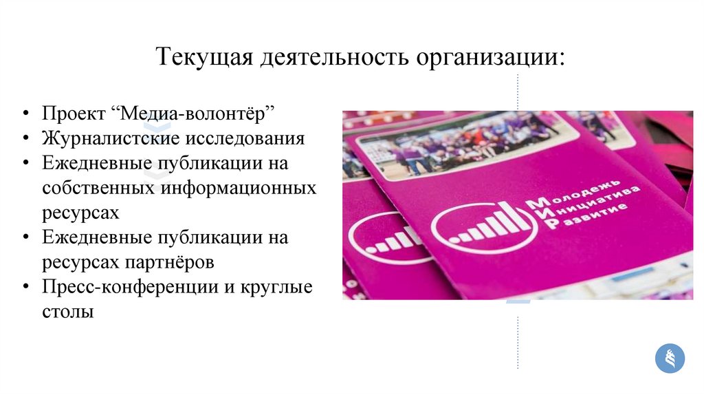 Текущая деятельность организации:• Проект “Медиа-волонтёр”