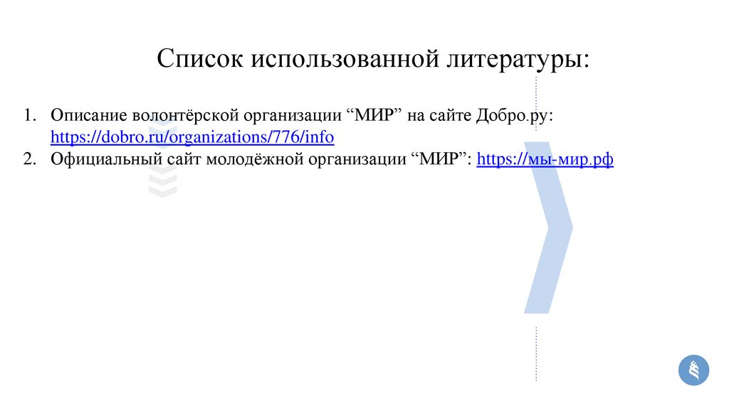 Список использованной литературы:1. Описание волонтёрской организации “МИР” на сайте Добро.ру: