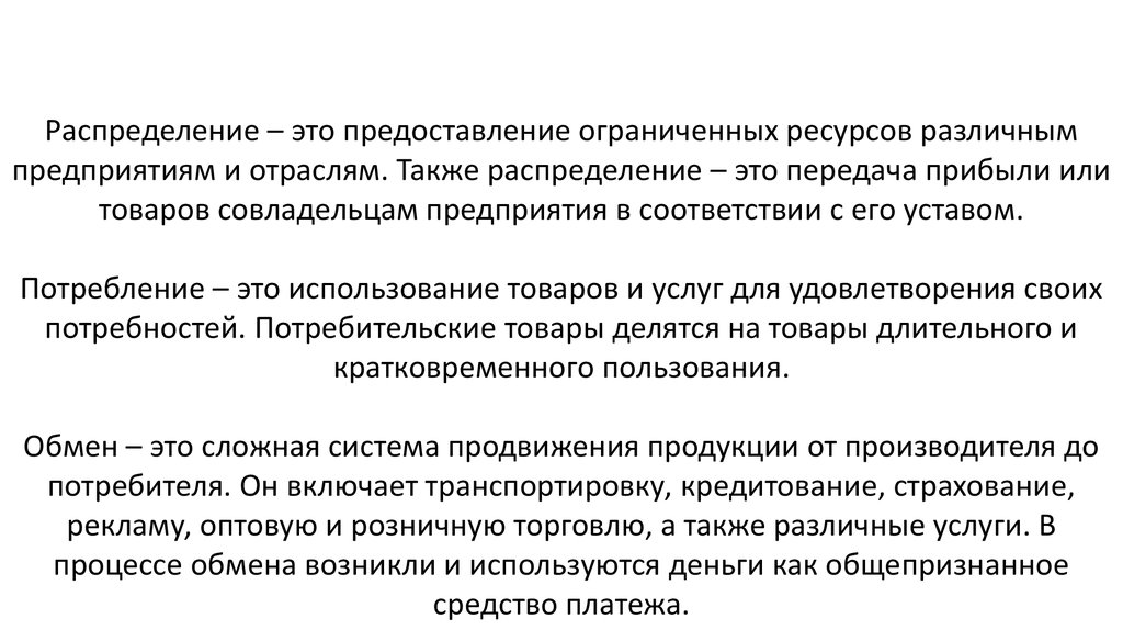 Распределение – это предоставление ограниченных ресурсов различнымпредприятиям и отраслям. Также распределение – это передача прибыли или