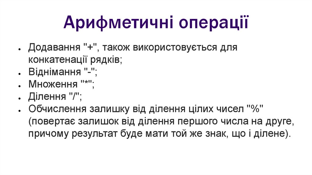 Арифметичні операціїДодавання "+", також використовується для