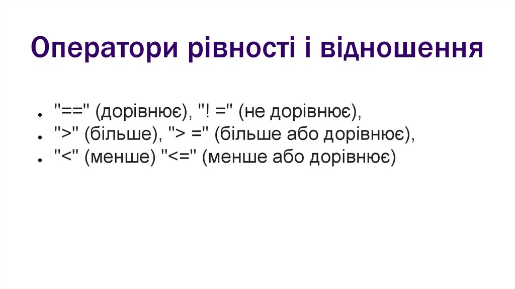 Оператори рівності і відношення"==" (дорівнює), "! =" (не дорівнює),